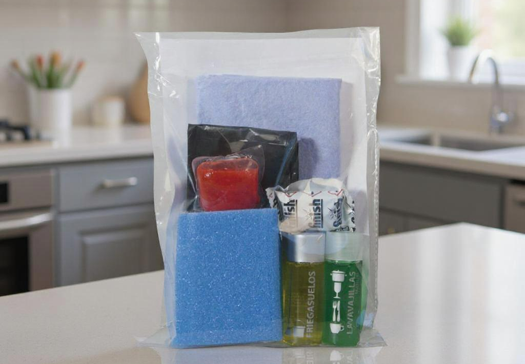 Nuestro kit de apartamentos es uno de los productos más demandados y mejor valorados por nuestros clientes. Incluye todo lo esencial para poder asegurar una estancia cómodo y limpia: estropajo, bayeta, pastilla para el lavavajillas, monodosis para la lavadora, friegasuelos y líquido lavavajillas. Es el complemento perfecto para ofrecer en alquileres vacacionales y estancias cortas.
